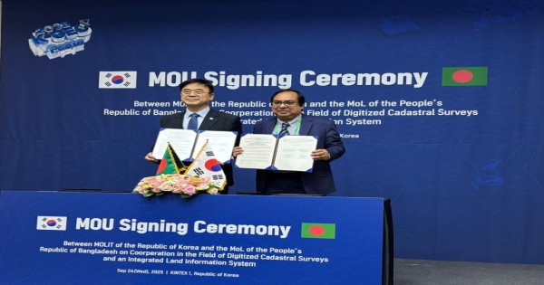 বুধবার ২৪ সেপ্টেম্বর ২০২৫ দক্ষিণ কোরিয়ায় আয়োজিত 2025 K- GEO Festa-এ দক্ষিণ কোরিয়ার Ministry of Land, Infrastructure and Transport এবং বাংলাদেশ সরকারের ভূমি মন্ত্রণালয়ের মধ্যে ডিজিটাইজড ক্যাডাস্ট্রাল সার্ভে এবং সমন্বিত ভূমি তথ্য ব্যবস্থাপনা সিস্টেম বাস্তবায়ন বিষয়ে একটি সমঝোতা স্মারক (MoU) স্বাক্ষরিত হয়। এর মাধ্যমে দেশে ভূমিসেবায় নতুন দিগন্তের উন্মোচন হলো।